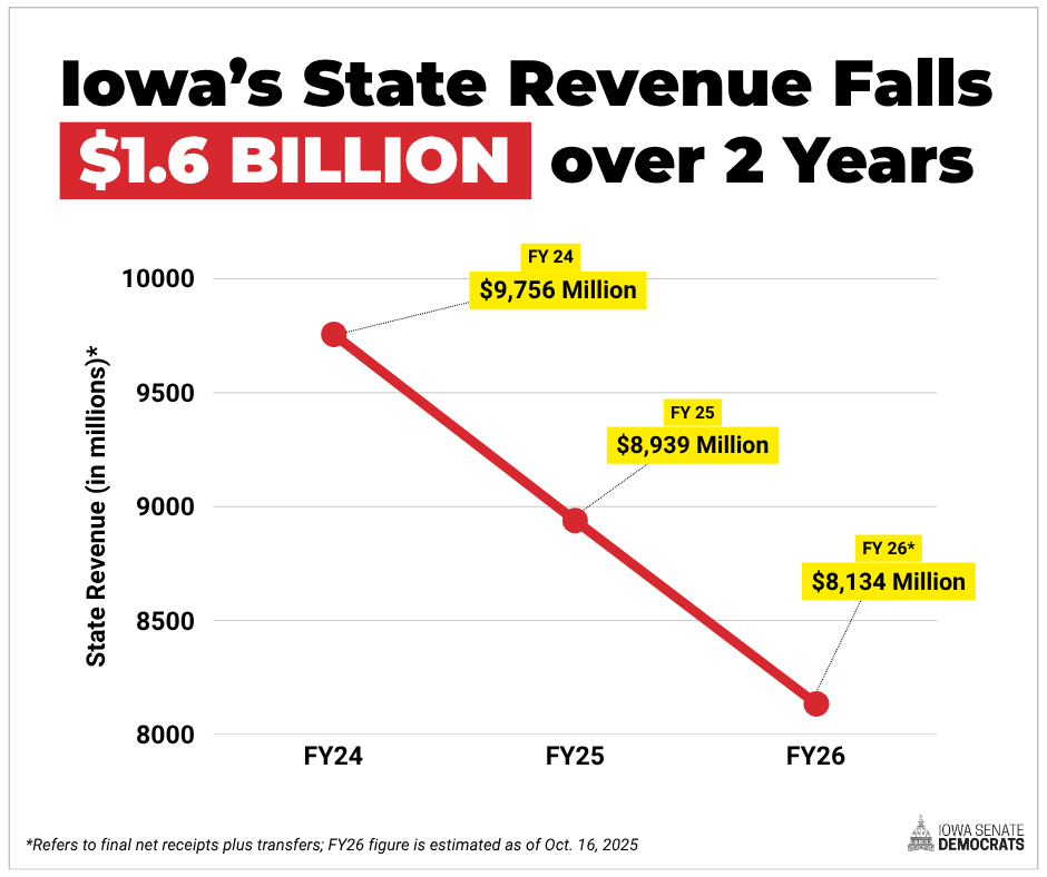 In the past two fiscal years, Iowa’s state revenues have dropped by more than $1.6 billion. As our revenues continue to shrink, the state will have to pull billions of dollars from our reserve funds to balance the budget, breaking Republican lawmakers’ own rules against using one-time funds for ongoing expenses and spending more money than we take in.