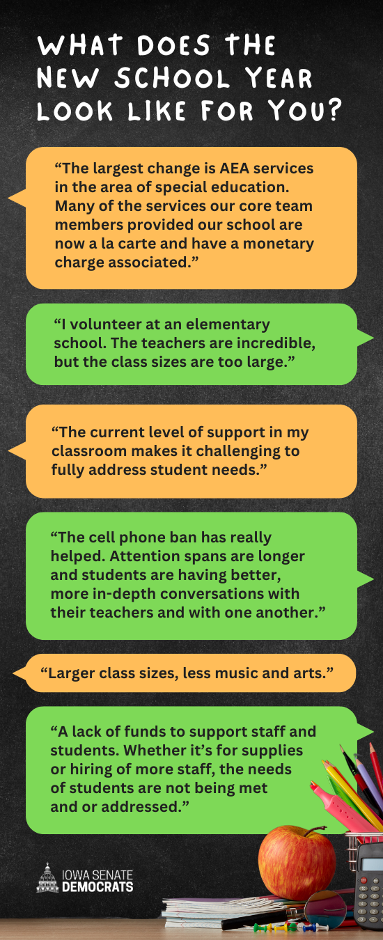 - We received many responses concerned about changes to AEA funding. Teachers and administrators cited diminished access to the support and resources they’d relied on for needs like special education, digital resources, and PT/OT/speech therapies. Some AEA staffers responded saying they have been stretched thin and lost coworkers – many are forced to do too much with too little.