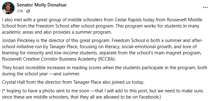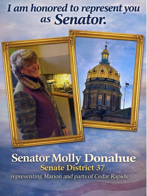 I’m so proud to represent our shared community, and I want you to know that you can always reach out to me with any questions, comments, concerns, or just to say, “Hey!” So, in addition to staying in touch through this weekly newsletter, you can reach me at molly.Donahue@legis.iowa.gov or donahueforrep@gmail.com, or message me on social media at the links below.