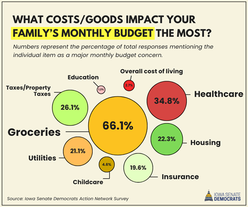 We know Iowans are feeling the squeeze as household budgets get tighter and tighter. That’s why we’ve made lowering costs and making life more affordable for working families our main priority going forward. So, we asked: What costs/goods impact your family’s monthly budget the most?