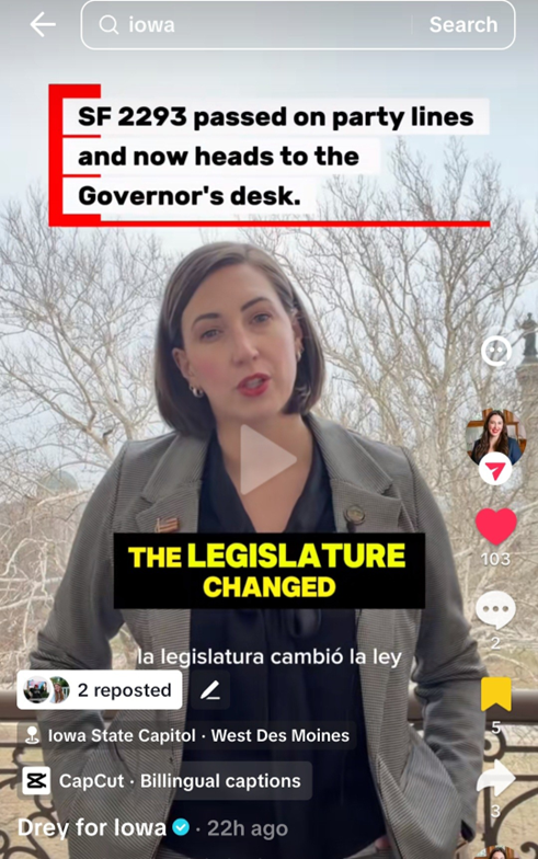 Over the past few weeks, thousands of Iowans have been following along with my updates from the Capitol on Facebook, Instagram, and TikTok. I started posting those videos to explain what’s happening in the Iowa Senate in plain language, and the response has been incredible. More importantly, the conversations remind me how many people across Iowa are paying attention to what’s happening at the Statehouse.