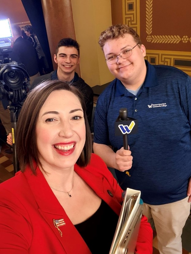Sen. Drey with Western Iowa Tech Community College Mass communications students Luke Larson and Evan Amundson.
